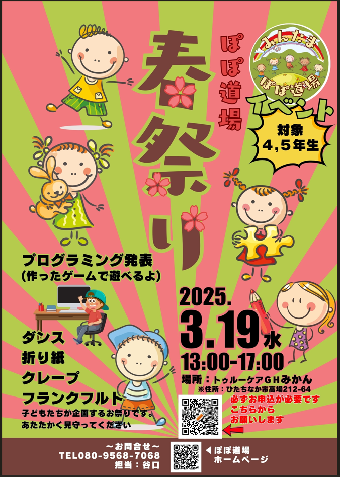 普段のぽぽ道場に参加してない5年生さんも来てね! 小学校4年生さんもこの春祭りでぽぽ道場を体験してみましょう♪ 当日は学校が自主学習の日だそうですね。午後のおやつはぽぽ道場でいかがですか? 参加費は無料、模擬店も無料、ゲームチャンレジも無料です~。